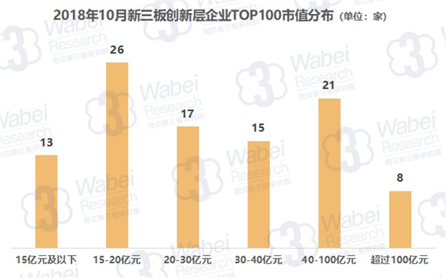 從TOP100企業(yè)的市值分布來看,市值超過100億元的企業(yè)有8家,而市值在15億元及以下、15-20億元、20-30億元、30-40億元、40-100億元的企業(yè)分別有13家、26家、17家、15家、21家。
