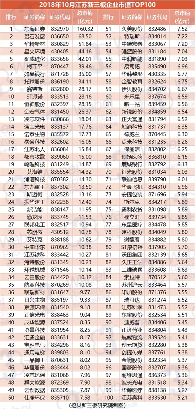 附:2018年10月江蘇新三板企業(yè)市值TOP100