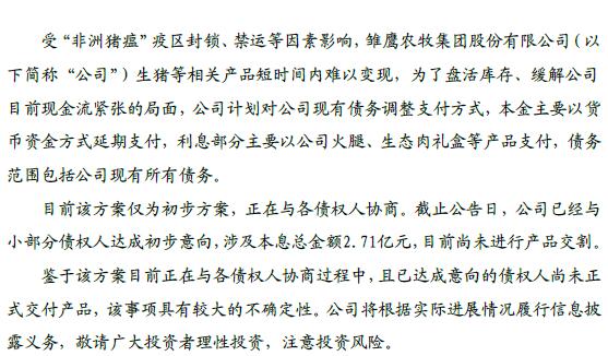 鷹農(nóng)牧稱,為了盤活庫存、緩解公司目前現(xiàn)金流緊張的局面,公司計(jì)劃用火腿、生態(tài)肉禮盒等產(chǎn)品支付債務(wù)利息。目前該方案僅為初步方案,正在與各債權(quán)人協(xié)商。截止公告日,公司已經(jīng)與小部分債權(quán)人達(dá)成初步意向,涉及本息總金額2.71億元,目前尚未進(jìn)行產(chǎn)品交割。