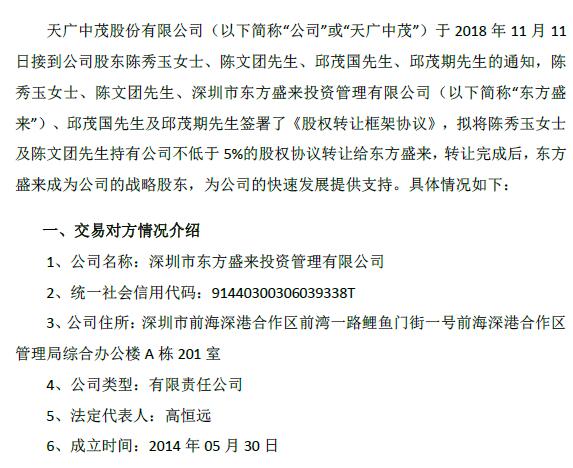 東方盛來的訂單放進(jìn)了購物框。第一步從天廣中茂(002509)原第一大股東陳秀玉及關(guān)聯(lián)方陳文團,收購不低于5%的股權(quán)。