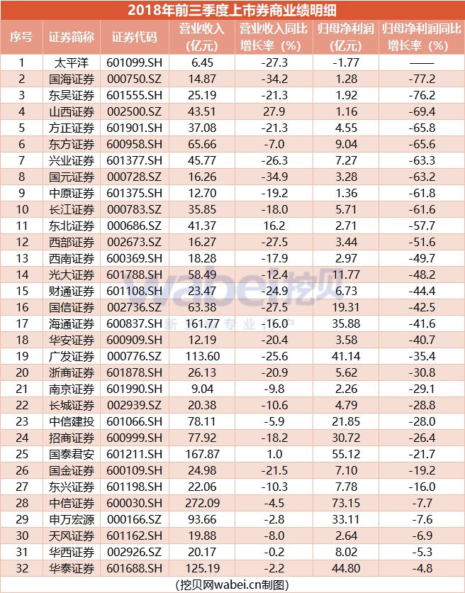 挖貝研究院數(shù)據(jù)顯示,32家上市券商前三季度利潤(rùn)同比全部下跌。10月份數(shù)據(jù)更為糟糕,當(dāng)月有6家券商虧損,而1-9月虧損的券商只有太平洋證券。