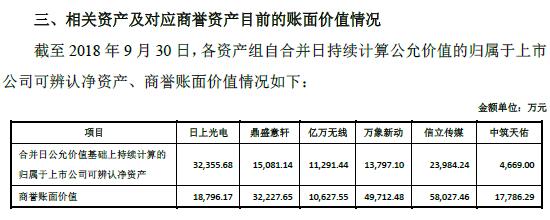 2015年5月完成對(duì)日上光電100%股權(quán)的收購,使其成為公司全資子公司。該次交易合并成本金額為3.9億元,合并日歸屬于上市公司可辨認(rèn)凈資產(chǎn)公允價(jià)值為2.02億元,確認(rèn)商譽(yù)1.88億元。截至2018年9月30日,日上光電含商譽(yù)的在合并日公允價(jià)值基礎(chǔ)上持續(xù)計(jì)算的歸屬于上市公司可辨認(rèn)凈資產(chǎn)賬面價(jià)值5.12億元。